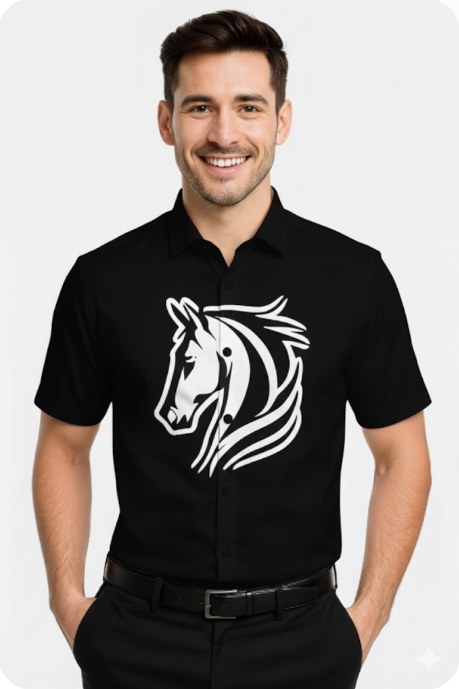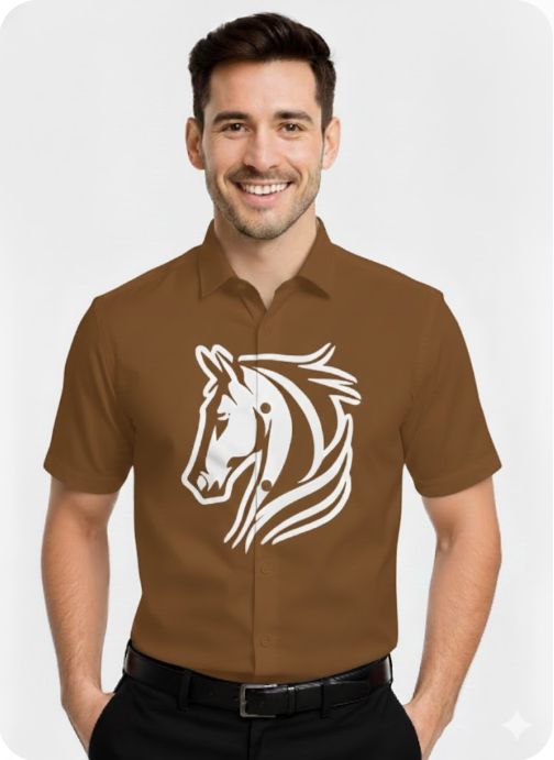 A sophisticated and stylish shirt designed for the modern man. Crafted from premium, breathable fabric in a rich Warm Brown shade, this shirt features a striking white equestrian (horse head) motif on the chest. The design is perfect for both casual outings and smart-casual events, offering a unique blend of comfort and distinctive style. It’s cut for a tailored, flattering fit and is an essential addition to a well-curated wardrobe.